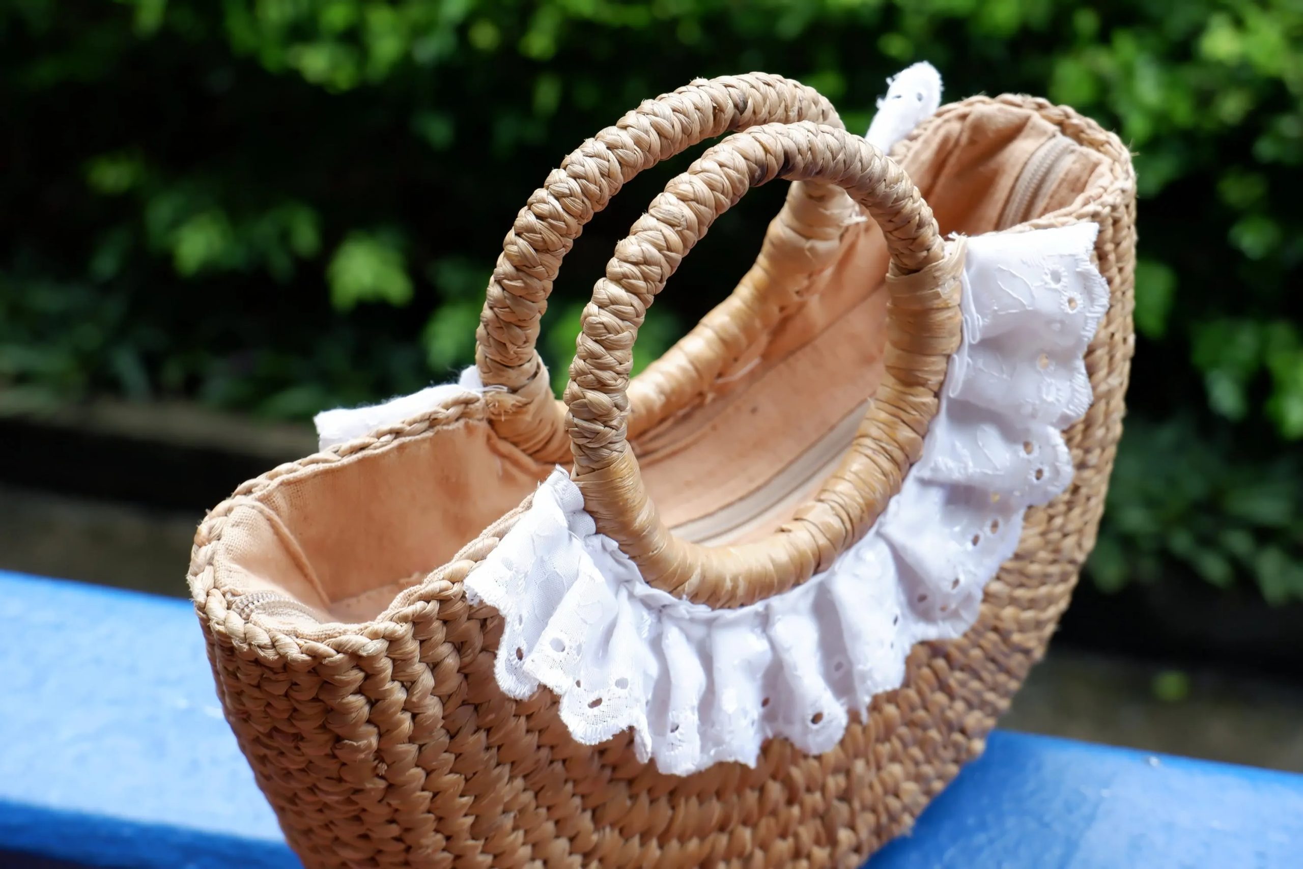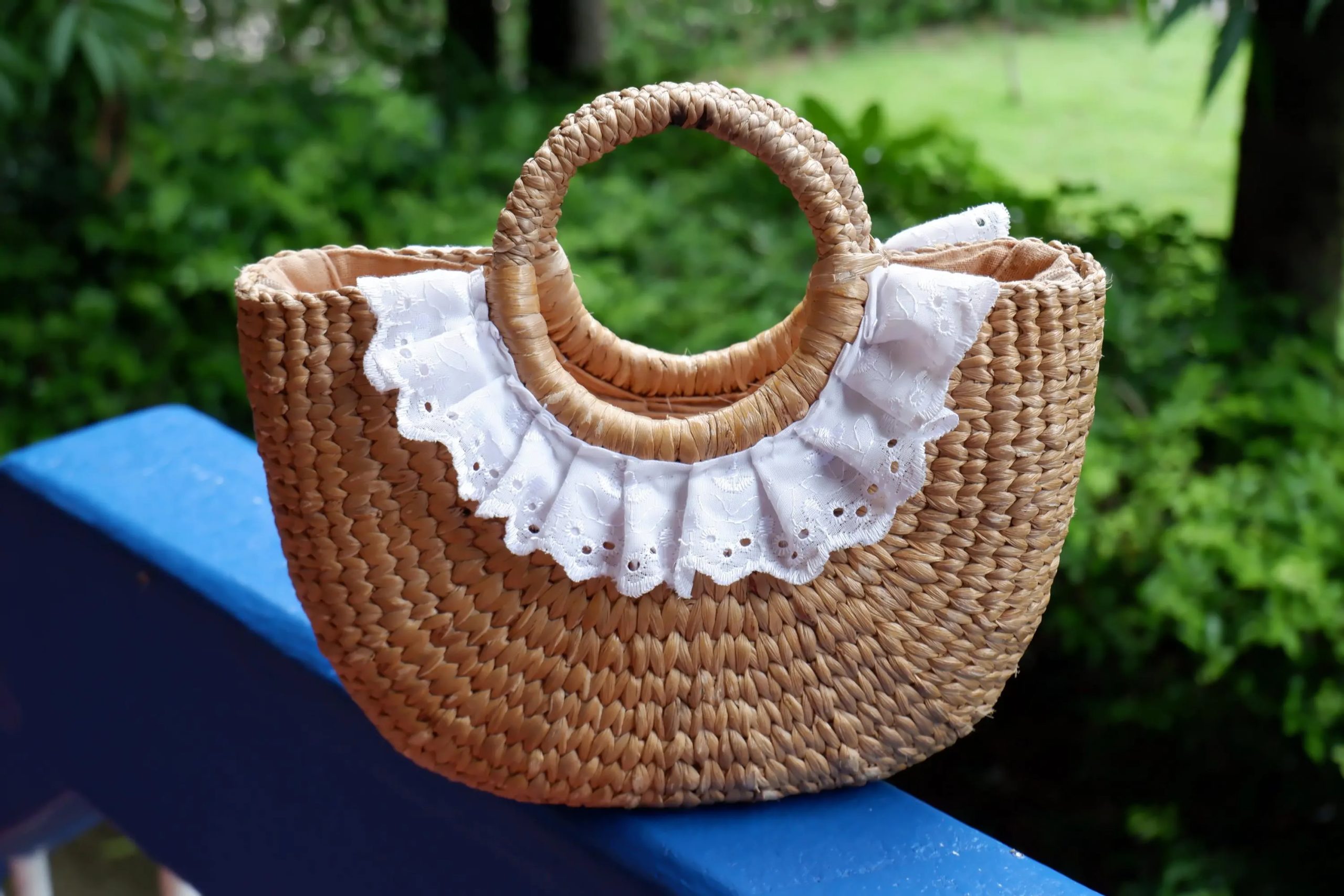 Around the round top handle, a white ruffled lace trim steals the spotlight—delicately embroidered with small cut-out details, it drapes like a pretty collar over the front of the bag. The contrast of crisp white lace against the natural weave gives the piece a sweet, feminine, almost cottagecore charm. The circular handle is comfortable to hold and adds a polished, sculptural finish.
