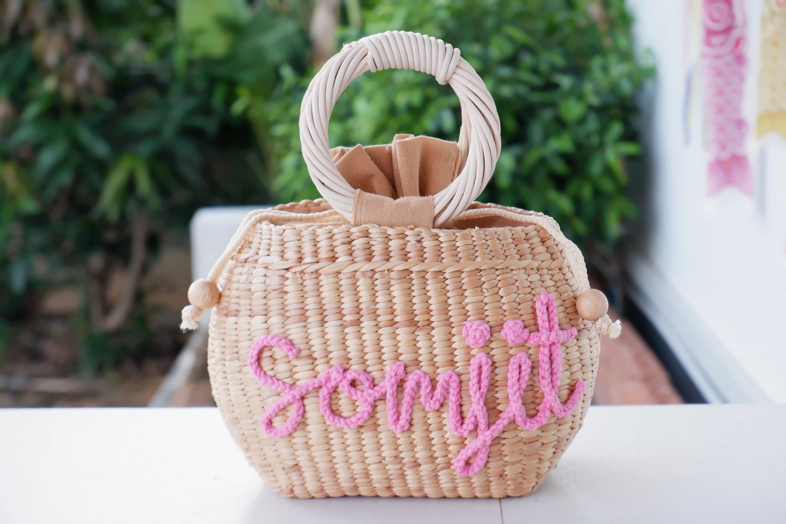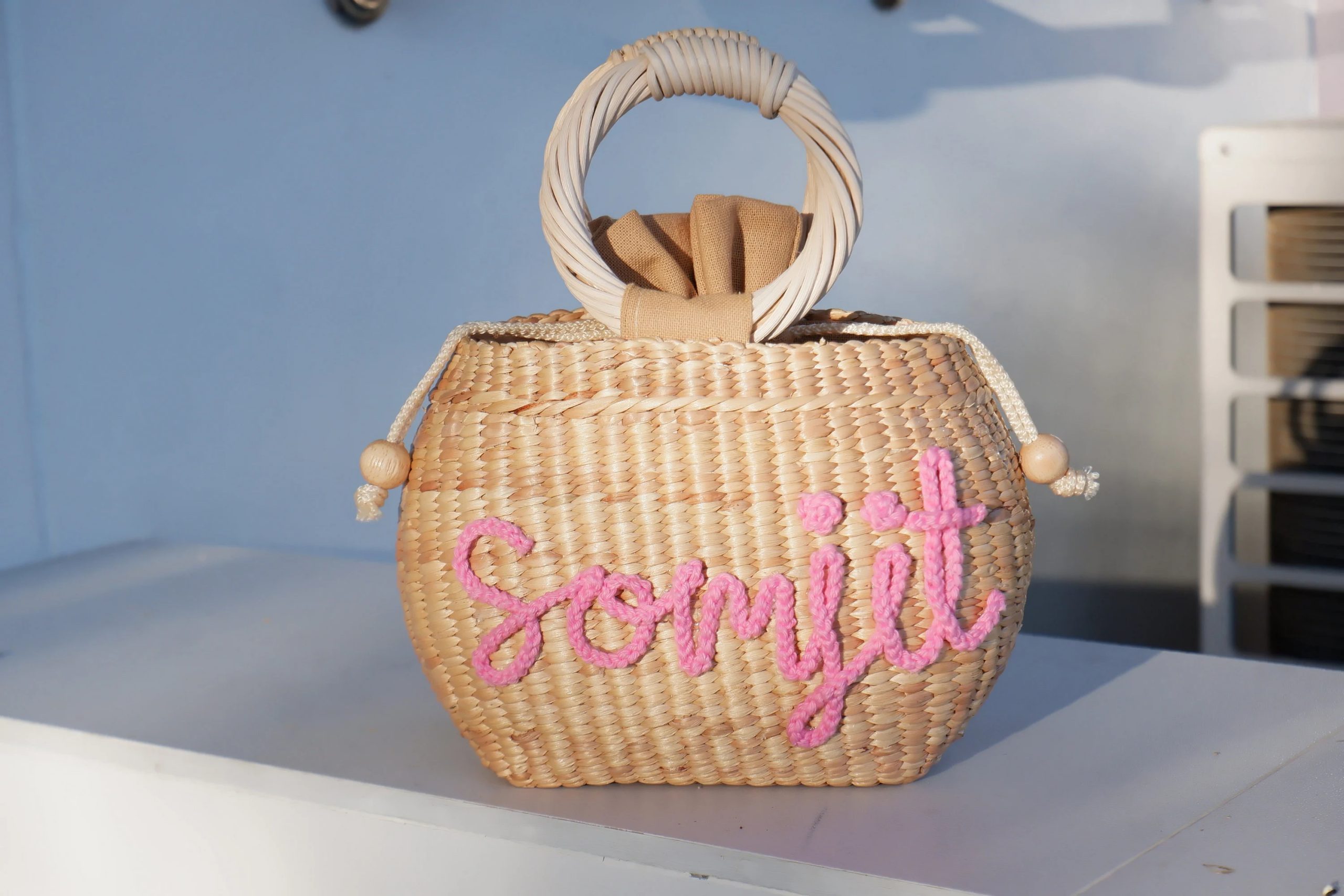 This charming woven tote blends natural texture with a playful, personalized touch. The body is crafted from straw-like fibers in a warm, sandy tone, tightly woven into a softly rounded silhouette that feels sturdy yet lightweight. On the front, a raised script word in fluffy pink yarn adds a fun pop of color and personality, making the bag stand out as a cute statement piece for everyday looks, brunch dates, or vacation photos.